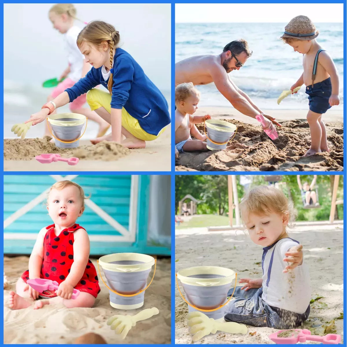 CUBOS PLEGABLES MULTIFUNCIÓN-Para que su viaje a la playa sea más ligero y portátil, utilizamos el cubo compresible, reducimos el peso del niño también puede levantarlo, el cubo compresible de juguete de Arena está hecho de gel de sílice, suave y no dañino para los niños. Los niños no solo pueden usar el cubo para divertirse en la playa, sino que también se pueden usar en la rutina diaria, como lavar el coche, regar las flores o limpiar la casa.