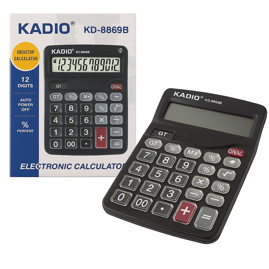 Calculadora marca Kadio modelo KK-8869B, cuenta con una pantalla que muestra 12 dígitos grandes para una lectura fácil de números. Producto en caja.
