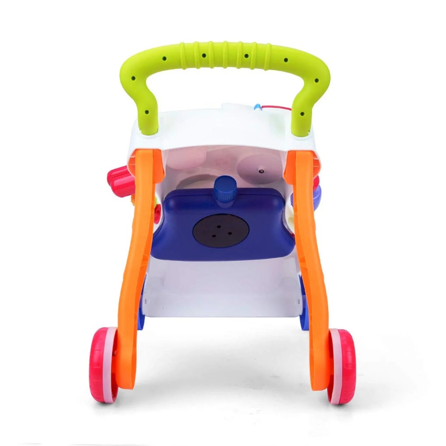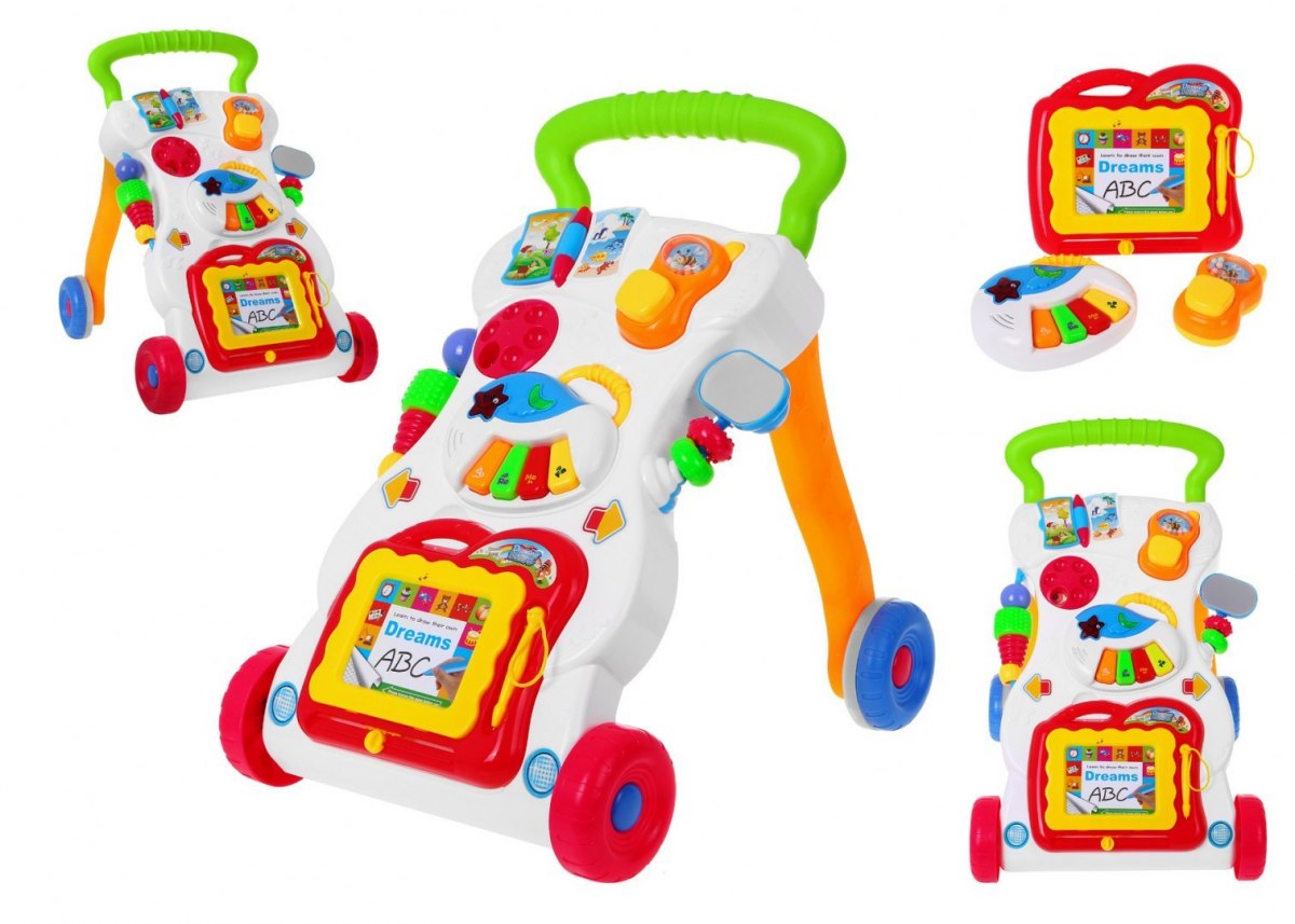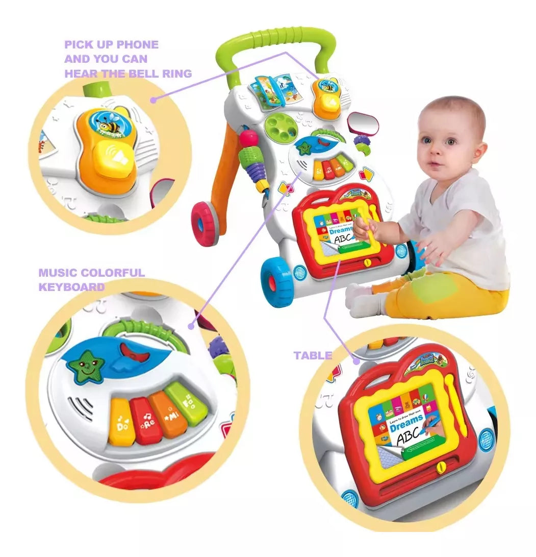 El divertido juguete para caminar, es perfecto para los primeros pasos de tu hijo con mucha diversión. Este producto tiene varios juguetes que estimulan todos los sentidos, como un tablero de dibujo magnético y un piano musical. La parte delantera tiene actividades educativas para enseñar y entretener: piano, pizarra mágica, espejo y mucho más, estos son 8 juguetes con los que divertirse. El andador didáctico lo pueden usar los bebés que ya están sentados a jugar y también lo pueden usar los bebés que ya están de pie. Ayuda a desarrollar la coordinación motora fina (manos y dedos) y la coordinación motora gruesa (brazos y piernas).