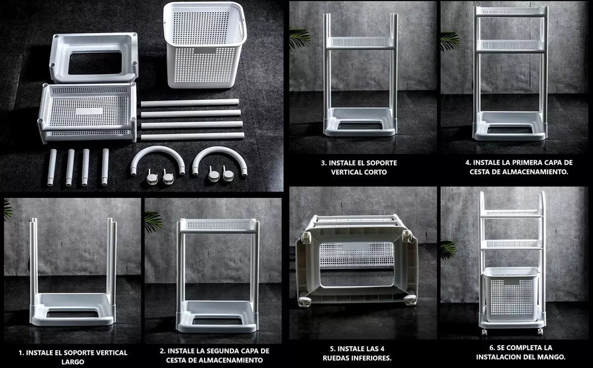 Cuenta con ruedas para facilitar su movilidad, y viene con un canasto desmontable, cuyas medidas son 34x39,5x30 cm. Tanto el carro como el canasto están hechos 100% de plástico, lo que garantiza su durabilidad y resistencia.