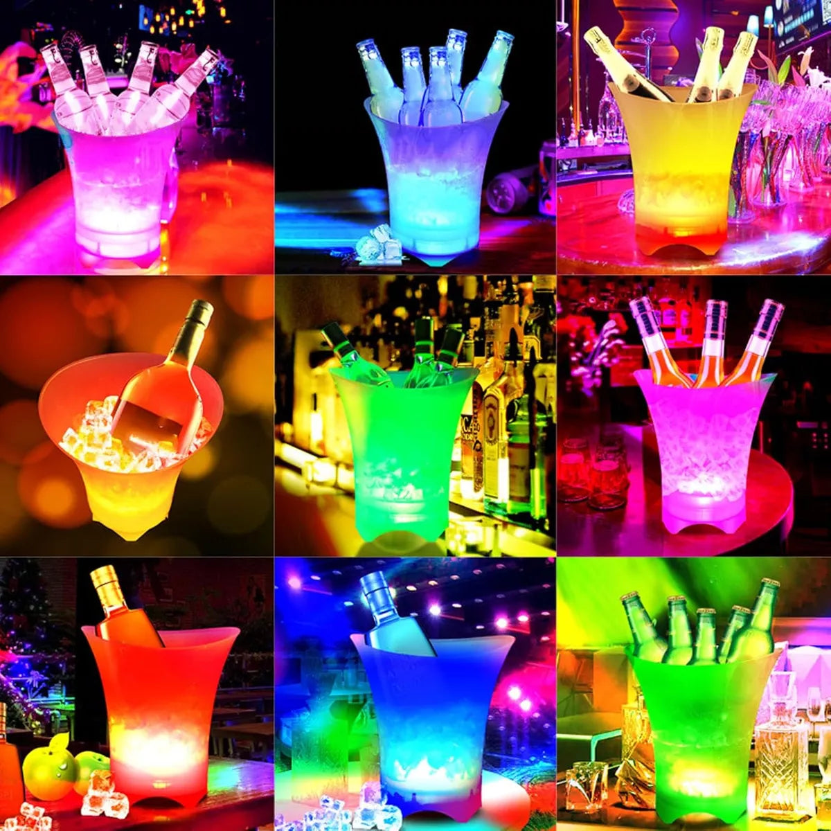 Disfruta de la comodidad de un cubo de hielo recargable que no solo mantiene tus bebidas frescas, sino que también proporciona un efecto de luz en rojo, azul y verde. Perfecto para enfriar tus bebidas favoritas y añadir un toque de elegancia a tu casa o bar.