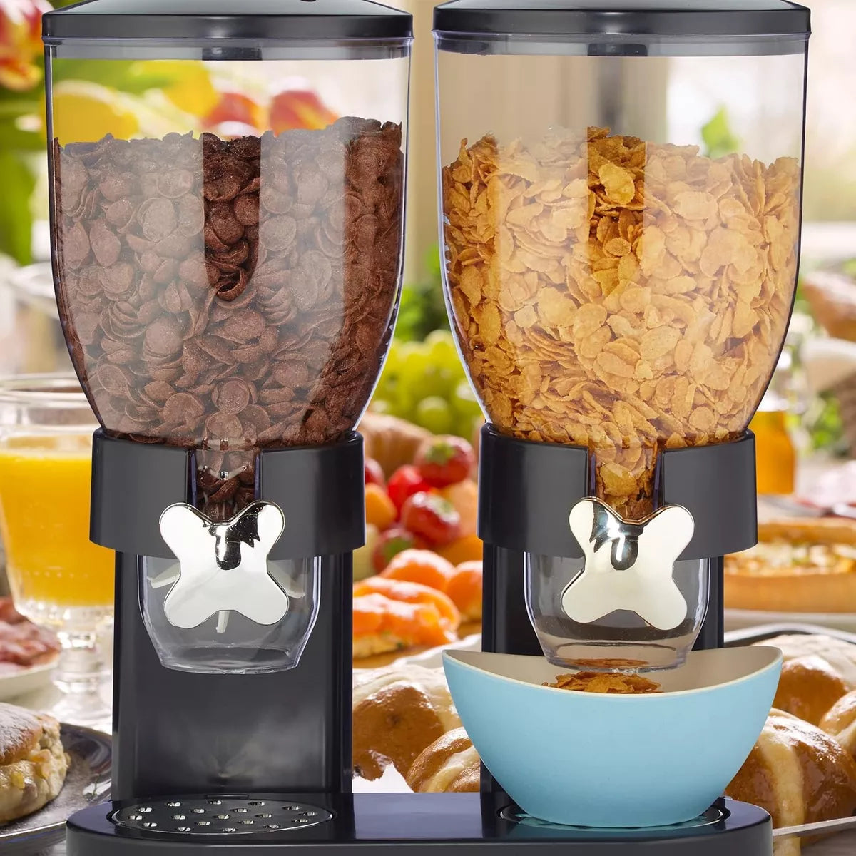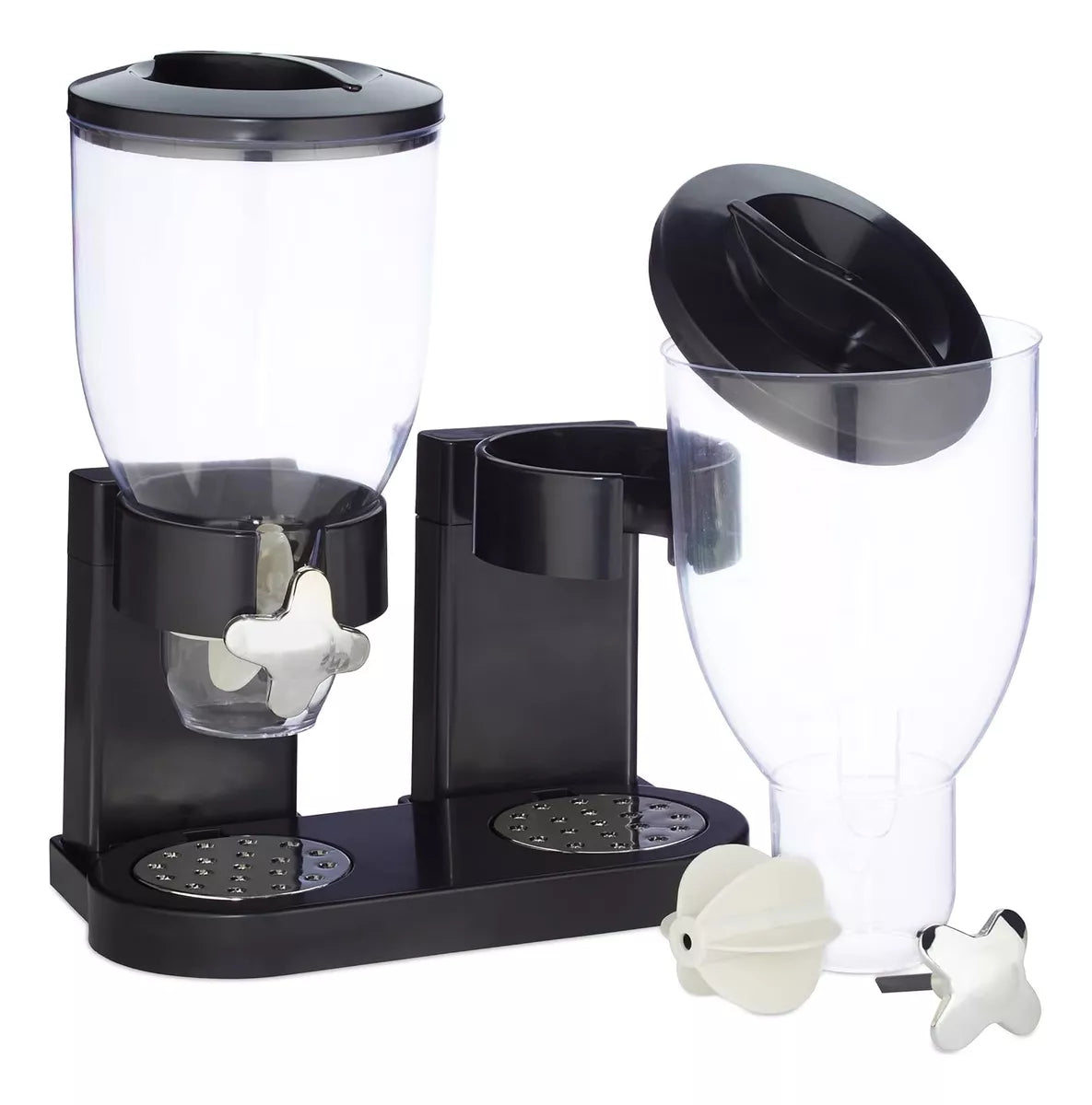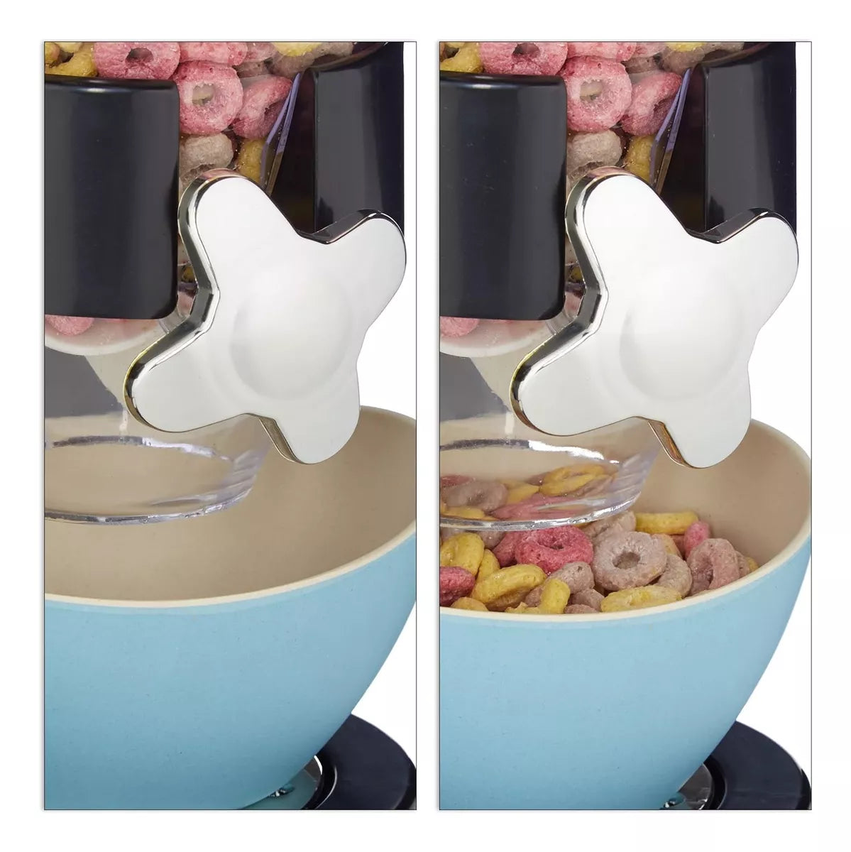 Un desayuno variado y saludable es imprescindible para empezar el día con buen pie. Los 2 recipientes de plástico permiten almacenar distintos tipos de cereales de manera compacta. La rueda permite regular la cantidad que cae cómodamente y la tapa es perfecta para mantener los 2 botes cerrados. También se puede utilizar para guardar golosinas o caramelos y servirlos de manera elegante. Además, cada recipiente tiene un compartimento recogemigas que se puede quitar y limpiar fácilmente.