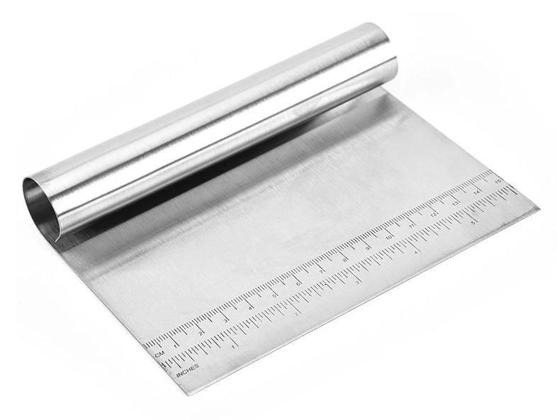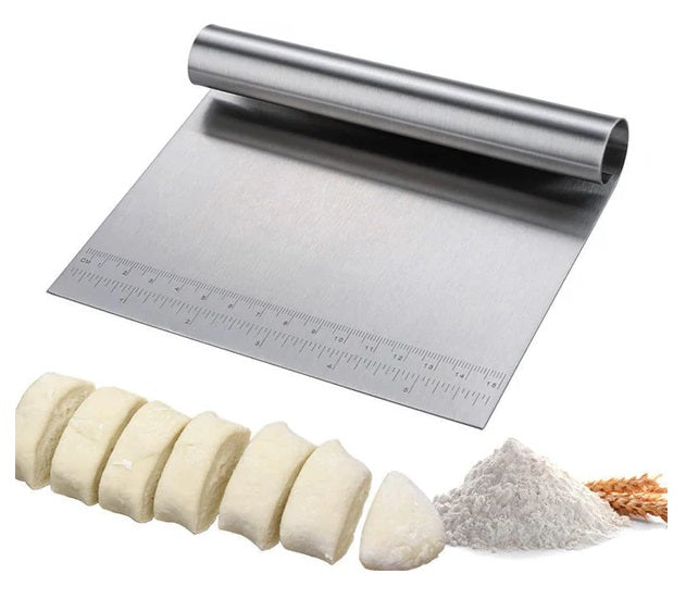Multiusos: esta herramienta de cocina tiene una larga lista de características útiles. Picador de metal multiusos, raspador de banco, licuadora de pastelería, cortador de masa, pala de raspado, cuchara de verduras es ideal para mezclar y rebanar masa, pasta, pan, pastel o galletas. Utilízalo para picar verduras y otros ingredientes esenciales o como un raspador de tabla de cortar.