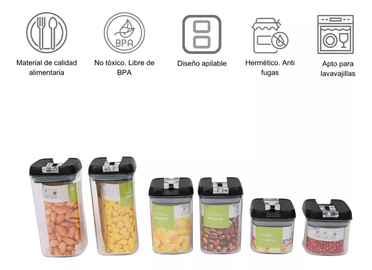 Sus tapas cuentan con un sistema que sella el contenedor e impide el flujo de oxígeno al interior, lo cual permite conservar los alimentos y mantenerlos frescos por un tiempo prolongado.