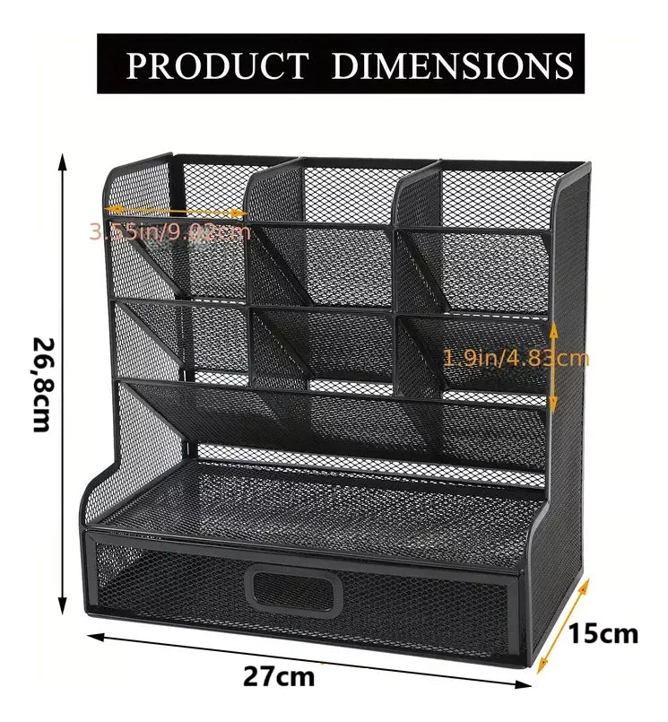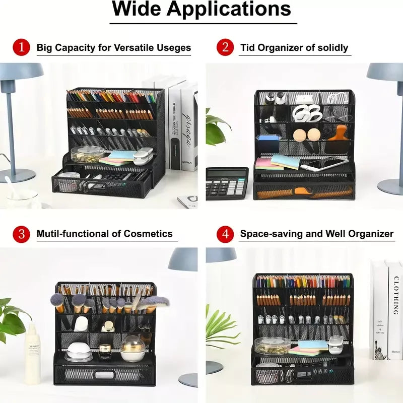 ORGANIZADOR DE ESCRITORIO MULTIFUNCIONAL DE MALLA organizador de escritorio y accesorios tiene 9 bandejas de bolígrafos individuales, 1 compartimento de almacenamiento plano y 1 cajón extraíble. El portalápices puede almacenar cientos de lápices, marcadores, herramientas de costura y blocs de notas por separado, lo que le permite mantenerse alejado de escritorios desordenados y mantenerse organizado