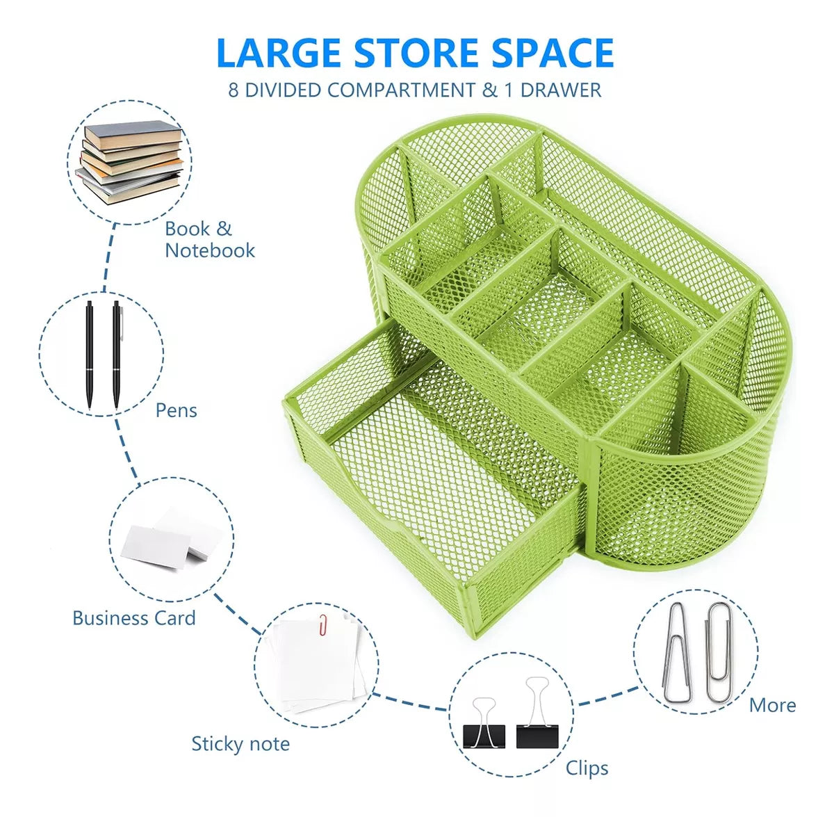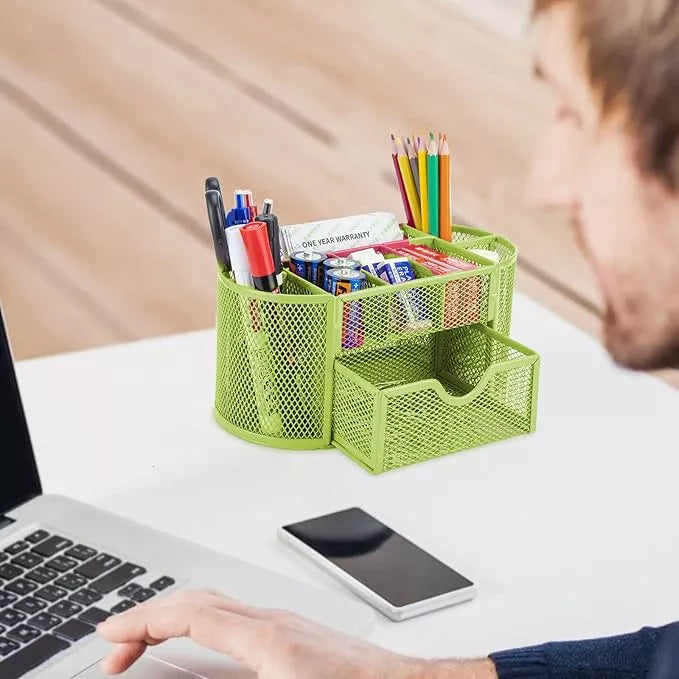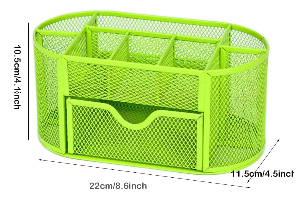 Diseñado con 8 compartimentos y un cajón, este organizador permite una distribución eficiente de tus herramientas, facilitando el acceso a lo que necesitas en cada momento. Su construcción en metal garantiza durabilidad y resistencia, asegurando que tu espacio de trabajo se mantenga ordenado y estilizado.