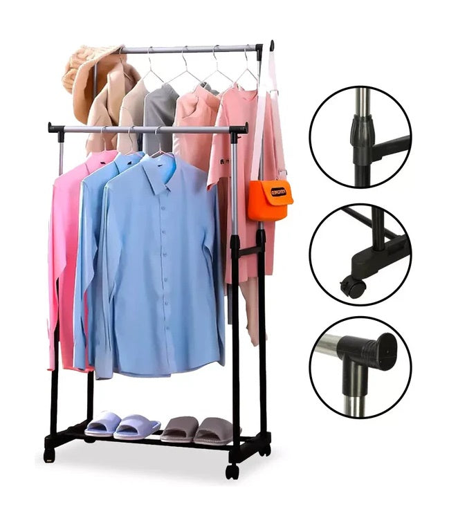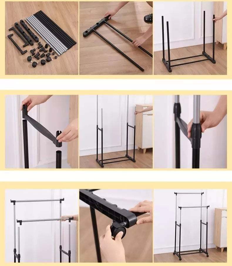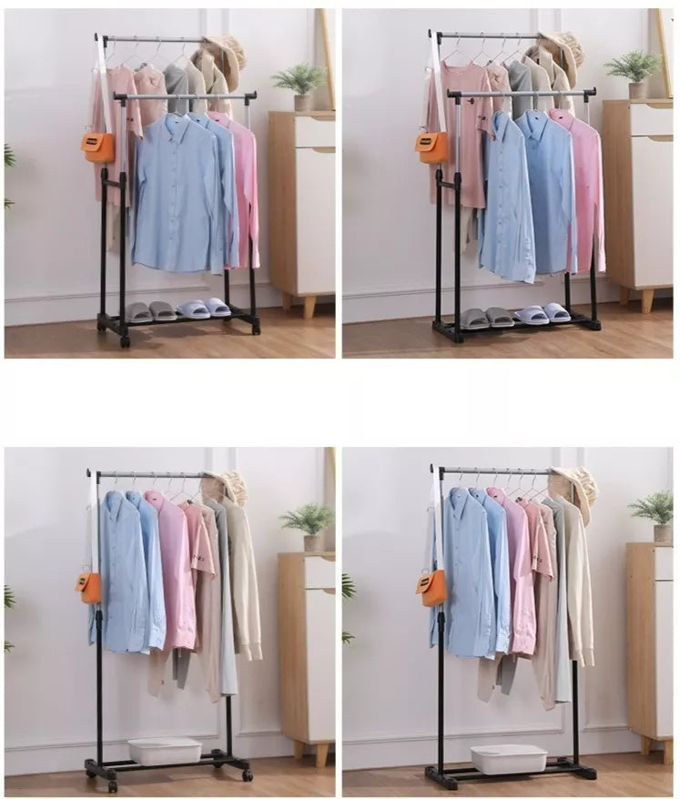 Hecho de postes de acero inoxidable y materiales plásticos duraderos Altura ajustable y fácil de mover Puede contener grandes cargas de ropa con su fuerte estructura de metal Perfecto para organizar la ropa Ideal para secar la ropa en interiores o exteriores Se pliega para un fácil almacenamiento Excelente solución de almacenamiento.