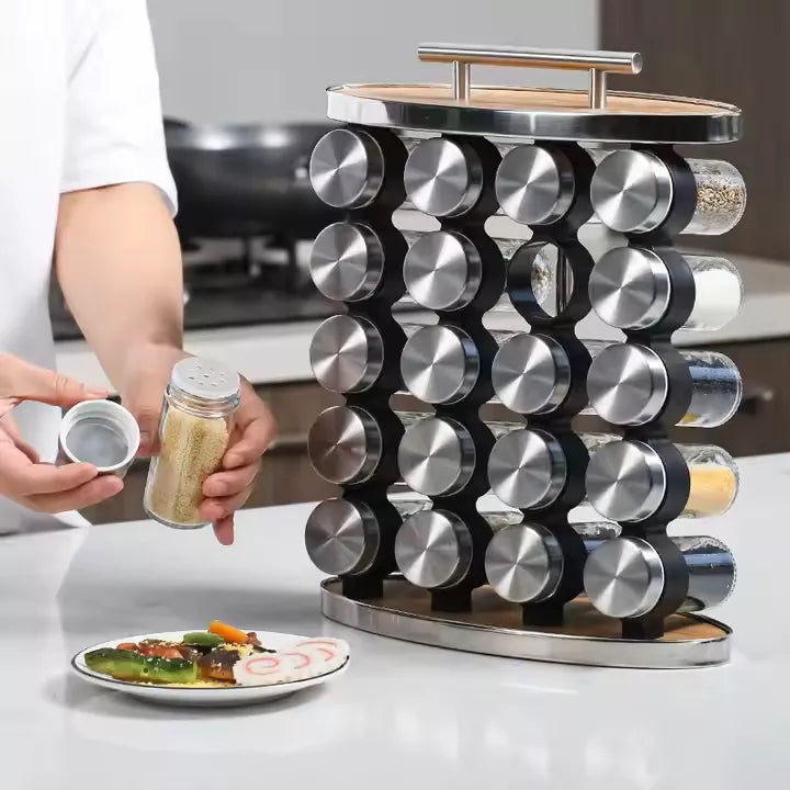 Diseño moderno: incluye un especiero de acero inoxidable y bambú y 20 frascos de especias vacíos (especias no incluidas). Los frascos de especias tienen tapas de rosca con cuerpos de vidrio transparente y tapas de plástico para mezclar y dispensar fácilmente.