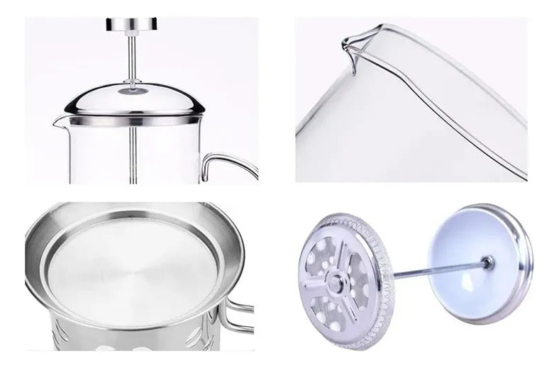 Todos los materiales individuales superan los requisitos de calidad de grado alimentario/bebida. Colador de tapa de plástico, acero inoxidable clasificado de grado alimenticio 304, vidrio térmico de la prensa del café