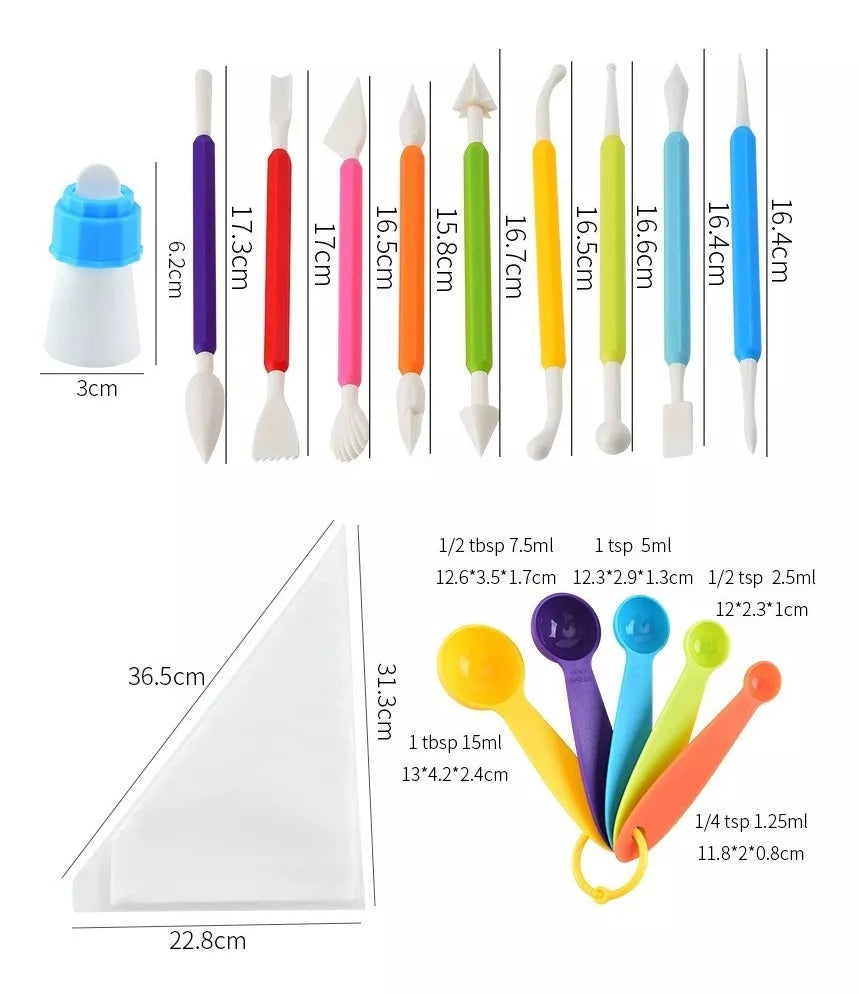 Incluye diferentes tipos de herramientas de uso repostero para decoración de tortas y postres.