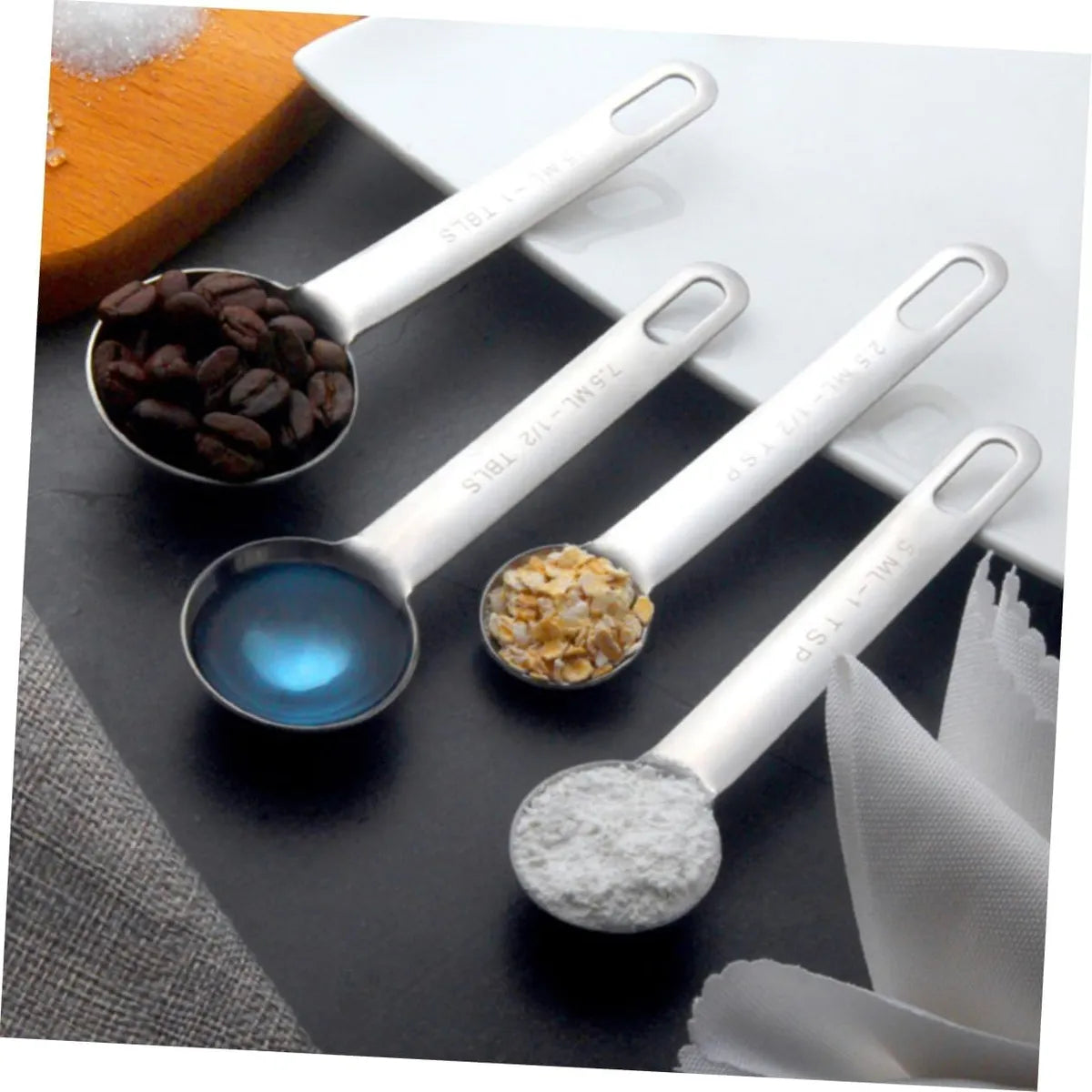 4 tamaños diferentes: nuestro juego de cucharas de medición incluye 4 cucharas de diferentes tamaños con las medidas grabadas.