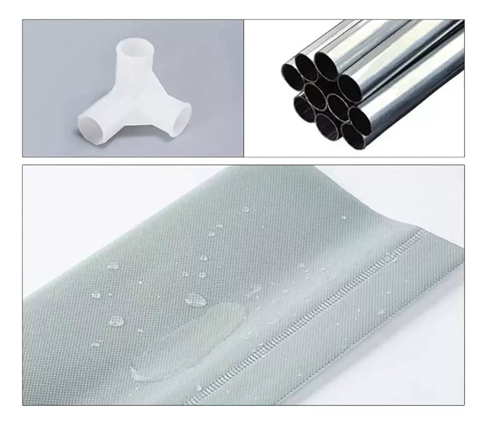 Material impermeable y fácil de limpiar. Montaje y desmontaje sencillos sin necesidad de herramientas. Cubierta de tela ecológica con cremallera para un cierre seguro. Cortina de puerta enrollable con sujeción de velcro. Estructura ligera y fácil de transportar.